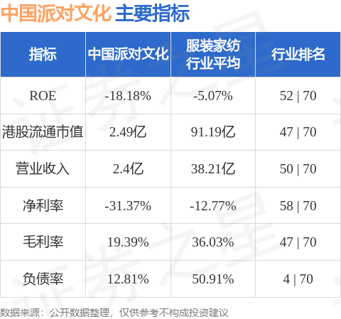 中国派对文化港股市值2.49亿港元,在服装家纺行业中排名第47。主要指标见下表: