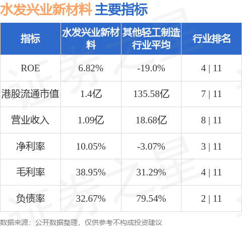 水发兴业新材料港股市值1.4亿港元,在其他轻工制造行业中排名第7。主要指标见下表: