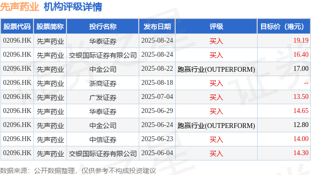 截至2025年8月26日收盘,先声药业(02096.HK)报收于14.44港元,下跌2.43%,成交量1640.4万股,成交额2.39亿港元。投行对该股的评级以买入为主,近90天内共有7家投行给出买入评级,近90天的目标均价为15.23港元。华泰证券最新一份研报给予先声药业买入评级,目标价19.19港元。