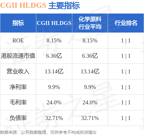CGII HLDGS港股市值6.36亿港元,在化学原料行业中排名第1。主要指标见下表: