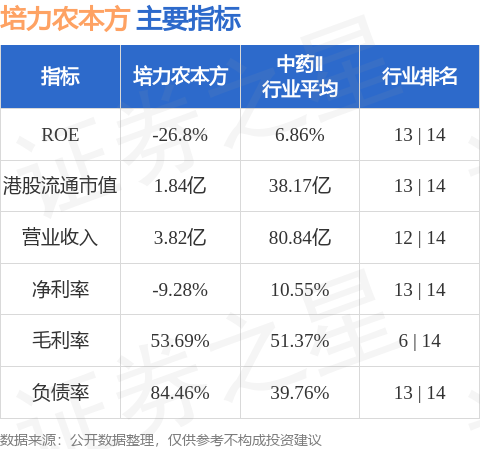 培力农本方港股市值1.84亿港元,在中药Ⅱ行业中排名第13。主要指标见下表:
