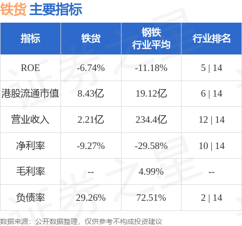 铁货港股市值8.43亿港元,在钢铁行业中排名第6。主要指标见下表: