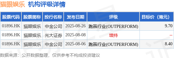 投行对该股的评级以跑赢行业(OUTPERFORM)为主,近90天内共有2家投行给出跑赢行业(OUTPERFORM)评级,近90天的目标均价为9.05港元。中金公司最新一份研报给予猫眼娱乐跑赢行业(OUTPERFORM)评级,目标价9.7港元。
