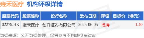 截至2025年8月27日收盘,雍禾医疗(02279.HK)报收于2.99港元,下跌5.97%,成交量110.15万股,成交额330.54万港元。投行对该股的评级以增持为主,近90天内共有1家投行给出增持评级,近90天的目标均价为1.4港元。创升证券有限公司最新一份研报给予雍禾医疗增持评级,目标价1.4港元。