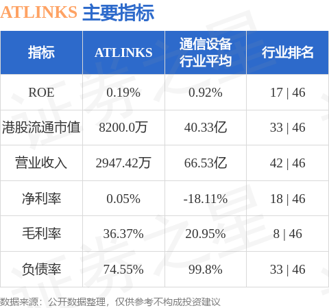 ATLINKS港股市值8200万港元,在通信设备行业中排名第33。主要指标见下表: