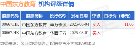 截至2025年8月27日收盘,中国东方教育(00667.HK)报收于8.08港元,下跌4.83%,成交量727.42万股,成交额5977.63万港元。投行对该股的评级以买入为主,近90天内共有2家投行给出买入评级,近90天的目标均价为11.06港元。申万宏源最新一份研报给予中国东方教育买入评级,目标价11.06港元。