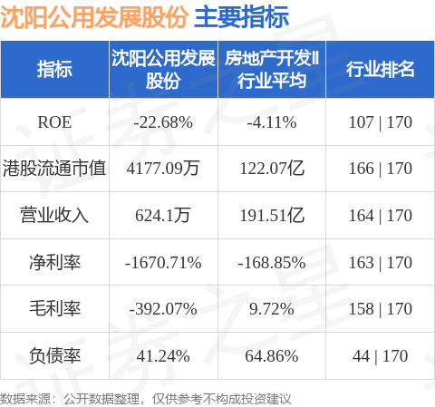 沈阳公用发展股份港股市值4177.09万港元,在房地产开发Ⅱ行业中排名第166。主要指标见下表: