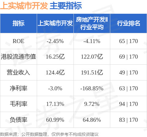 上实城市开发港股市值16.25亿港元,在房地产开发Ⅱ行业中排名第69。主要指标见下表: