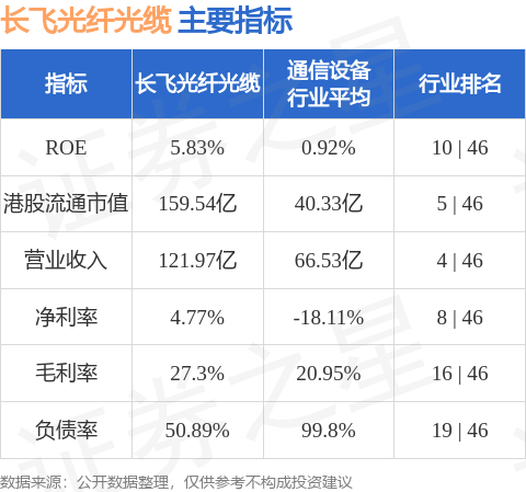 长飞光纤光缆港股市值159.54亿港元,在通信设备行业中排名第5。主要指标见下表: