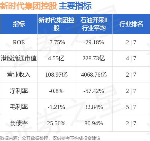 新时代集团控股港股市值4.55亿港元,在石油开采Ⅱ行业中排名第4。主要指标见下表:
