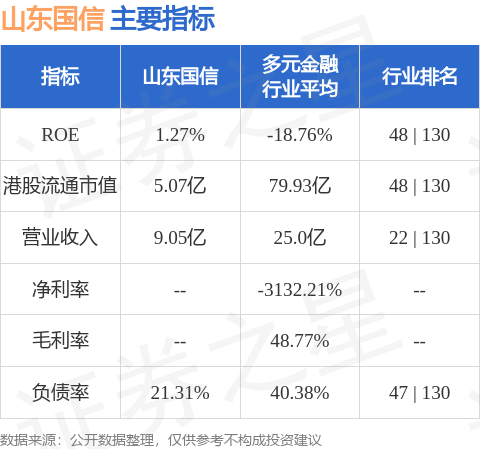 山东国信港股市值5.07亿港元,在多元金融行业中排名第48。主要指标见下表: