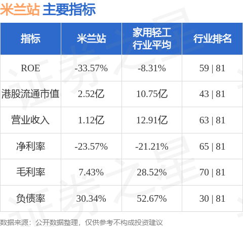 米兰站港股市值2.52亿港元,在家用轻工行业中排名第43。主要指标见下表:
