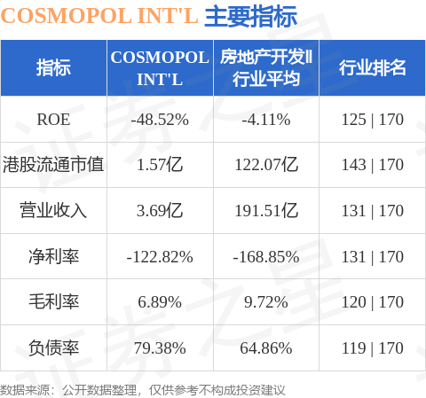 COSMOPOL INT'L港股市值1.57亿港元,在房地产开发Ⅱ行业中排名第143。主要指标见下表: