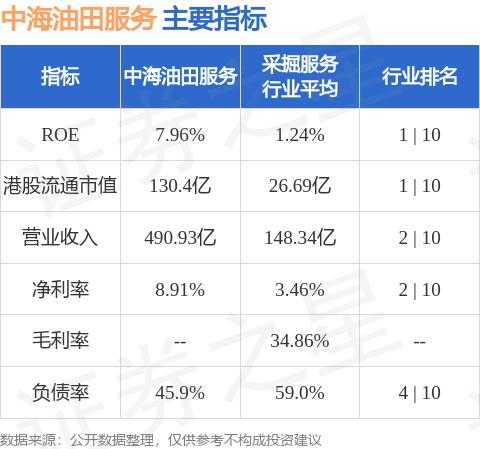 中海油田服务港股市值130.4亿港元,在采掘服务行业中排名第1。主要指标见下表: