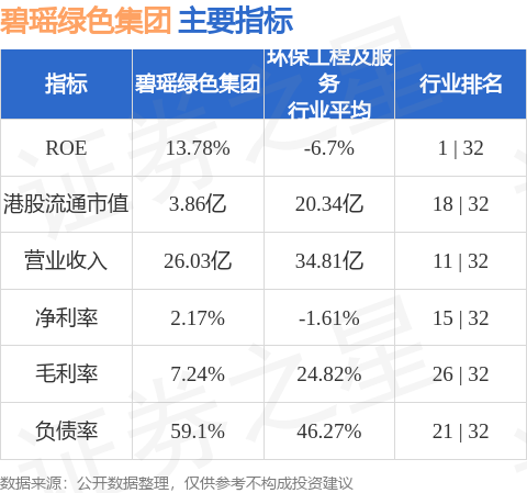 碧瑶绿色集团港股市值3.86亿港元,在环保工程及服务行业中排名第18。主要指标见下表: