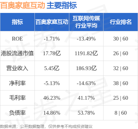 百奥家庭互动港股市值17.78亿港元,在互联网传媒行业中排名第26。主要指标见下表: