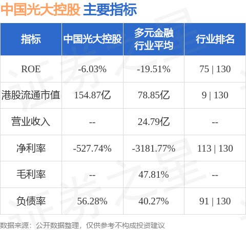 中国光大控股港股市值154.87亿港元,在多元金融行业中排名第9。主要指标见下表: