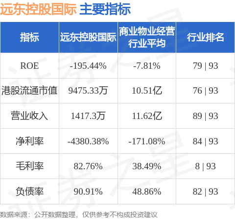 远东控股国际港股市值9475.33万港元,在商业物业经营行业中排名第76。主要指标见下表: