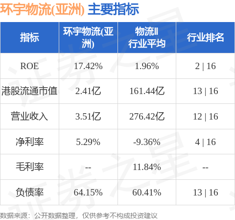 环宇物流(亚洲)港股市值2.41亿港元,在物流Ⅱ行业中排名第13。主要指标见下表: