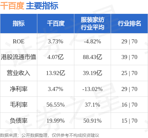 千百度港股市值4.07亿港元,在服装家纺行业中排名第39。主要指标见下表: