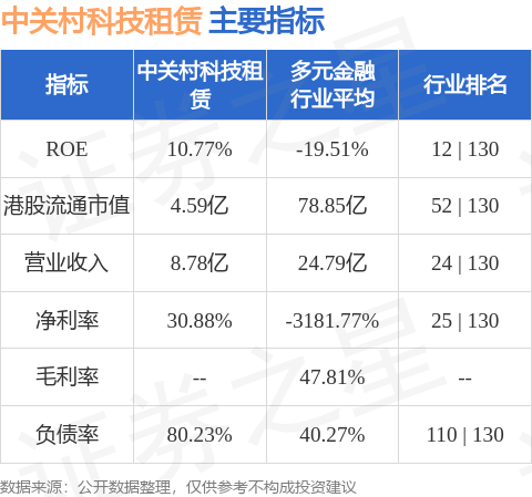 中关村科技租赁港股市值4.59亿港元,在多元金融行业中排名第52。主要指标见下表: