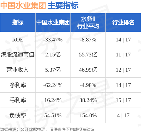 中国水业集团港股市值2.15亿港元,在水务Ⅱ行业中排名第11。主要指标见下表:
