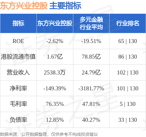 东方兴业控股港股市值1.67亿港元,在多元金融行业中排名第86。主要指标见下表: