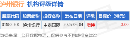 截至2025年8月28日收盘,泸州银行(01983.HK)报收于2.55港元,下跌0.39%,成交量1000.0股,成交额2550.0港元。投行对该股的评级以增持为主,近90天内共有1家投行给出增持评级,近90天的目标均价为3港元。中泰国际最新一份研报给予泸州银行增持评级,目标价3港元。
