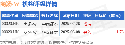 投行对该股的评级以增持为主,近90天内共有1家投行给出增持评级,近90天的目标均价为1.73港元。中泰证券最新一份研报给予商汤-W增持评级。