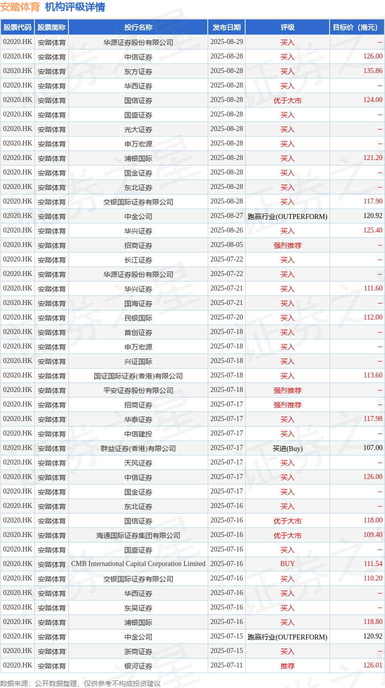 大和发布研报称,安踏体育(02020.HK)上半年收入及净利润分别较市场预期高1.5%与3.2%,Descente与Kolon Sport的增长势头好过预期。该行将2025至27年每股盈利预测上调3至4%,主要反映Amer Sports盈利指引修订,重申“买入”评级,目标价由112港元升至117港元。另外,集团持续展现其并购意欲,近期宣布与韩国领先时尚平台MUSINSA成立合资企业,正式将该知名零售品牌引入中国市场。