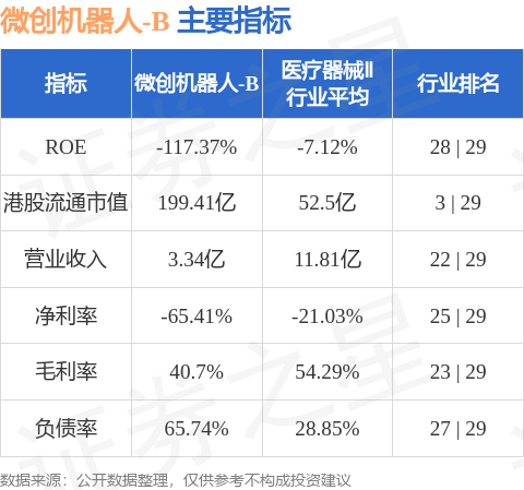 微创机器人-B港股市值199.41亿港元,在医疗器械Ⅱ行业中排名第3。主要指标见下表: