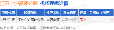 截至2025年8月29日收盘,江苏宁沪高速公路(00177.HK)报收于9.2港元,下跌3.46%,成交量1156.26万股,成交额1.07亿港元。投行对该股的评级以买入为主,近90天内共有1家投行给出买入评级。申万宏源最新一份研报给予江苏宁沪高速公路买入评级。