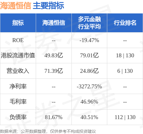 海通恒信港股市值49.83亿港元,在多元金融行业中排名第18。主要指标见下表: