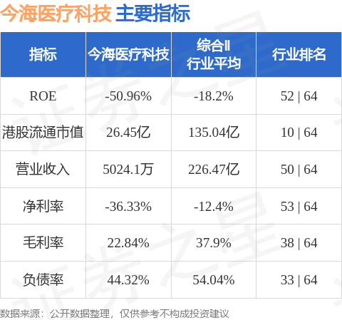 今海医疗科技港股市值26.45亿港元,在综合Ⅱ行业中排名第10。主要指标见下表:
