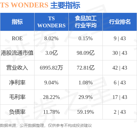 TS WONDERS港股市值3亿港元,在食品加工行业中排名第30。主要指标见下表: