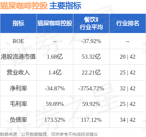 猫屎咖啡控股港股市值1.68亿港元,在餐饮Ⅱ行业中排名第20。主要指标见下表: