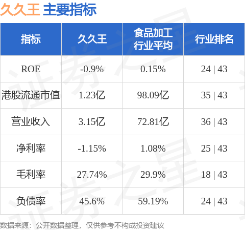 久久王港股市值1.23亿港元,在食品加工行业中排名第35。主要指标见下表: