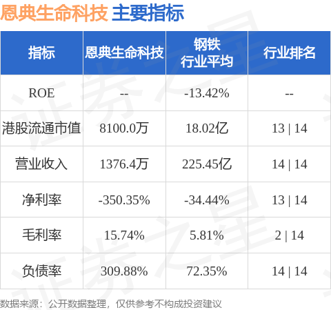 恩典生命科技港股市值8100万港元,在钢铁行业中排名第13。主要指标见下表: