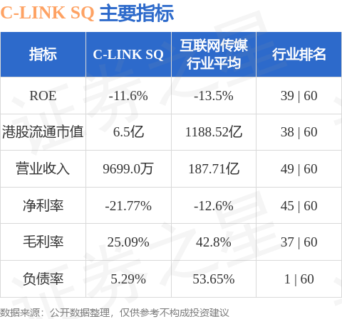 C-LINK SQ港股市值6.5亿港元,在互联网传媒行业中排名第38。主要指标见下表: