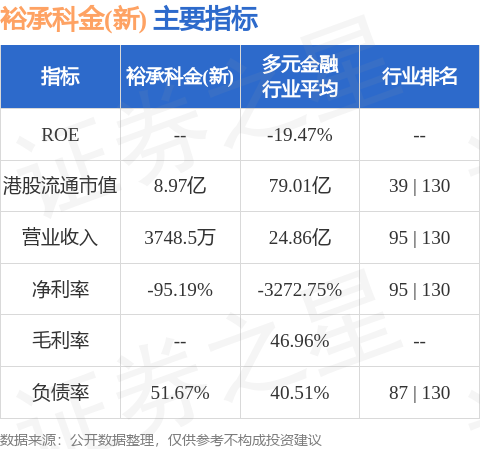裕承科金(新)港股市值8.97亿港元,在多元金融行业中排名第39。主要指标见下表: