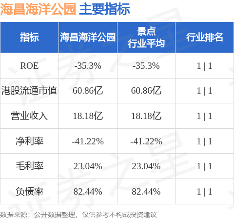 海昌海洋公园港股市值60.86亿港元,在景点行业中排名第1。主要指标见下表: