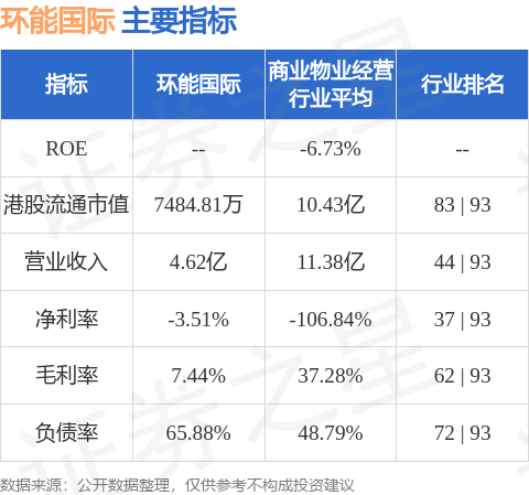 环能国际港股市值7484.81万港元,在商业物业经营行业中排名第83。主要指标见下表: