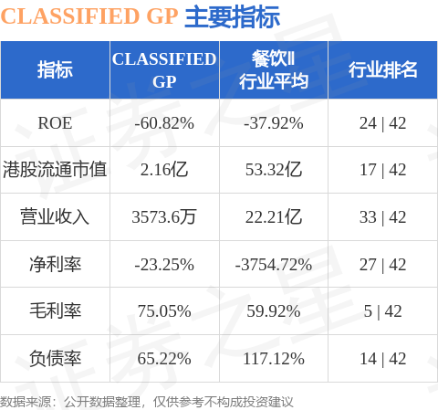 CLASSIFIED GP港股市值2.16亿港元,在餐饮Ⅱ行业中排名第17。主要指标见下表: