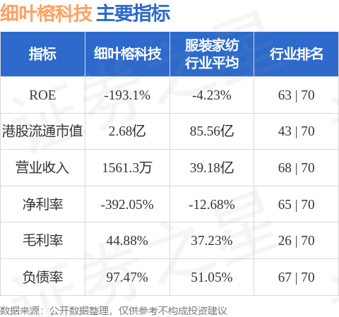 细叶榕科技港股市值2.68亿港元,在服装家纺行业中排名第43。主要指标见下表: