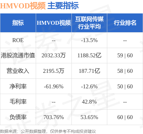 HMVOD视频港股市值2032.33万港元,在互联网传媒行业中排名第59。主要指标见下表: