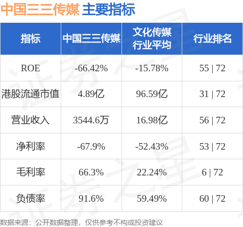 中国三三传媒港股市值4.89亿港元,在文化传媒行业中排名第31。主要指标见下表: