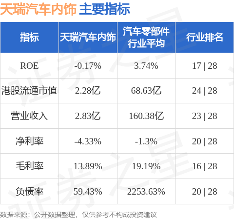 天瑞汽车内饰港股市值2.28亿港元,在汽车零部件行业中排名第24。主要指标见下表: