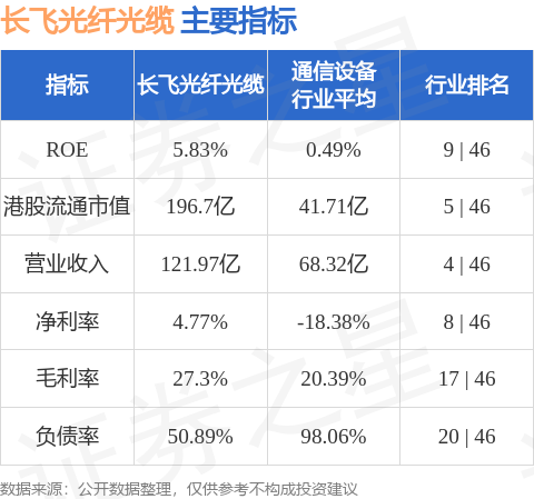 长飞光纤光缆港股市值196.7亿港元,在通信设备行业中排名第5。主要指标见下表: