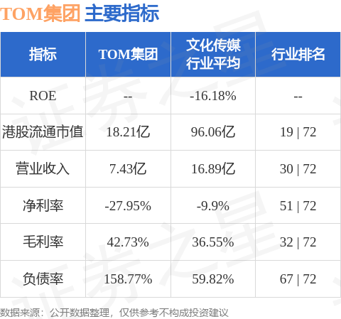 TOM集团港股市值18.21亿港元,在文化传媒行业中排名第19。主要指标见下表: