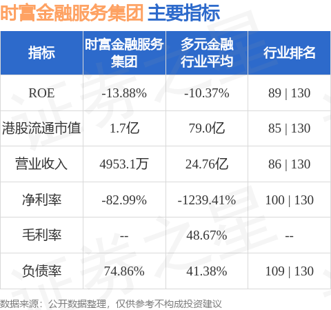 时富金融服务集团港股市值1.7亿港元,在多元金融行业中排名第85。主要指标见下表: